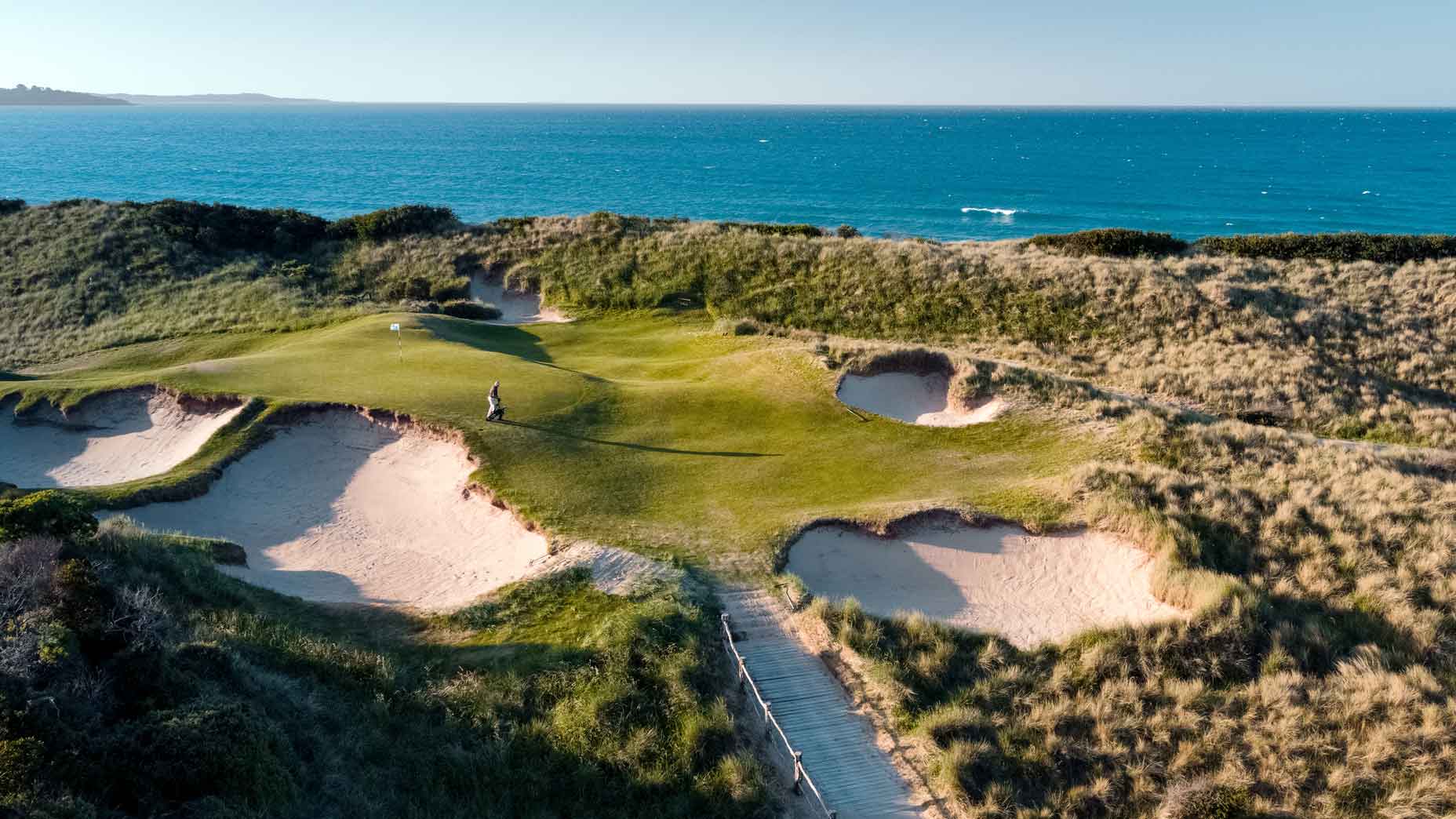 No. 7, a 122-yard par 3. Known as the “Tasmanian Devil,” this stunning, short hole can turn diabolical quickly — especially on a windy day. -