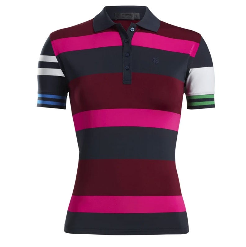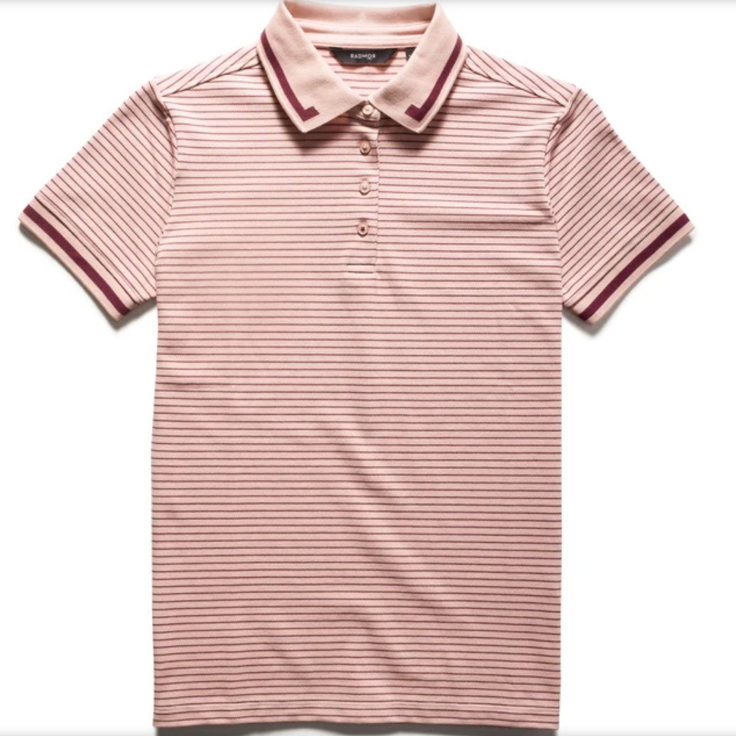 Yarn-dyed stripes in various widths and colors create a playful on-course look while the stretchy, fine jersey fabric provides anti-microbial and moisture-wicking properties.