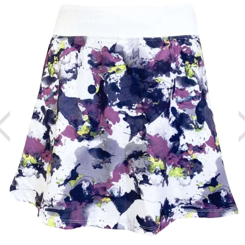 the Swing Skort is comfortable and lightweight with a feminine silhouette. It is designed with a woven fabric with a subtle pindot texture. The waistband and undershort are in our Elite fabric. This skirt has two front pockets and has a little volume all around for great movement. It is a 15″ length at a size small and has a body skimming fit.