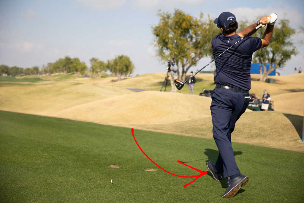 Most amateur golfers start looking at the ball at this point, but keep watching Phil’s swing and you’ll see something rather interesting: His lead foot spins out, so his toe is pointing at the target. You may think that’s a bad thing — that he’s losing his balance — but that’s not the case. This is an intentional move from Phil, and for good reason.