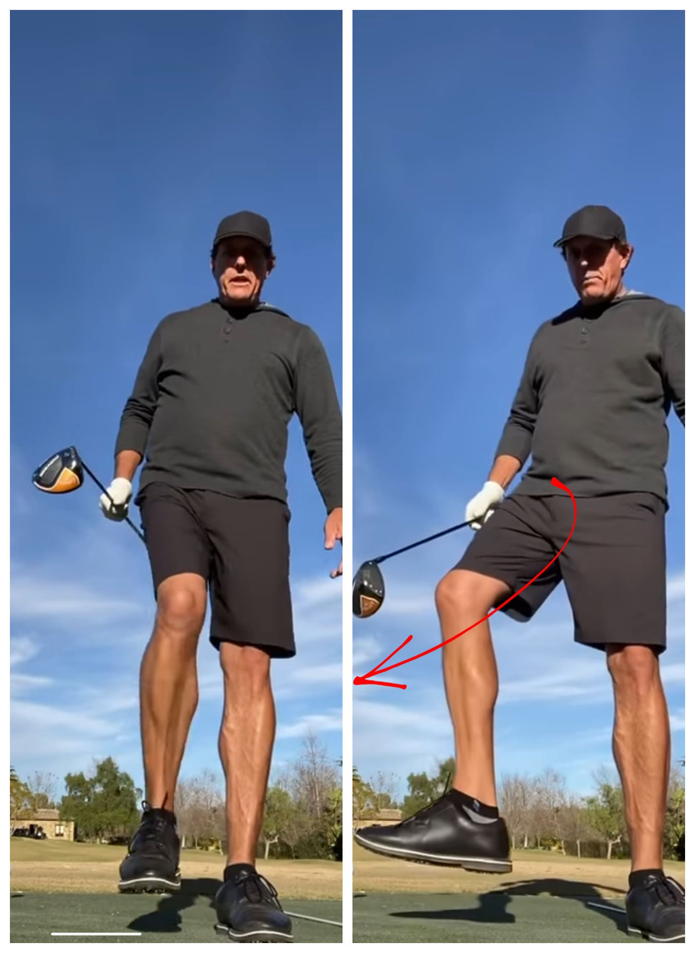 In an Instagram post earlier this year, Mickelson explained that allowing his left knee to “release” toward the target like this is an essential part of avoiding injury while chasing “bombs.” When you leave your foot rooted to the ground like you see Phil demonstrating below, but continue turning through, you’ll put strain on your knee and potentially cause injury.