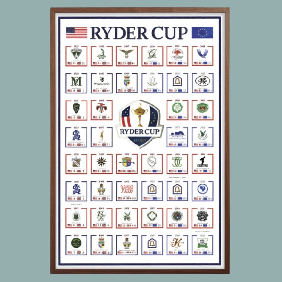 Introducing the History of the Ryder Cup artwork. The completely hand drawn piece captures all 96 years of the Ryder Cup matches and celebrates all 38 past host sites (updated through 2023). Each square displays the club logo and final score of the corresponding Ryder Cup match.