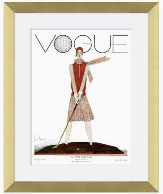 By Soicher Marin, French artist George Lepape designed theatrical sets and costumes as well as illustrated books and magazines. His June 20, 1929 cover of “Vogue” shows his Art Nouveau influences beautifully. This faithful reproduction, printed on archival paper, arrives matted, framed, and ready to hang.