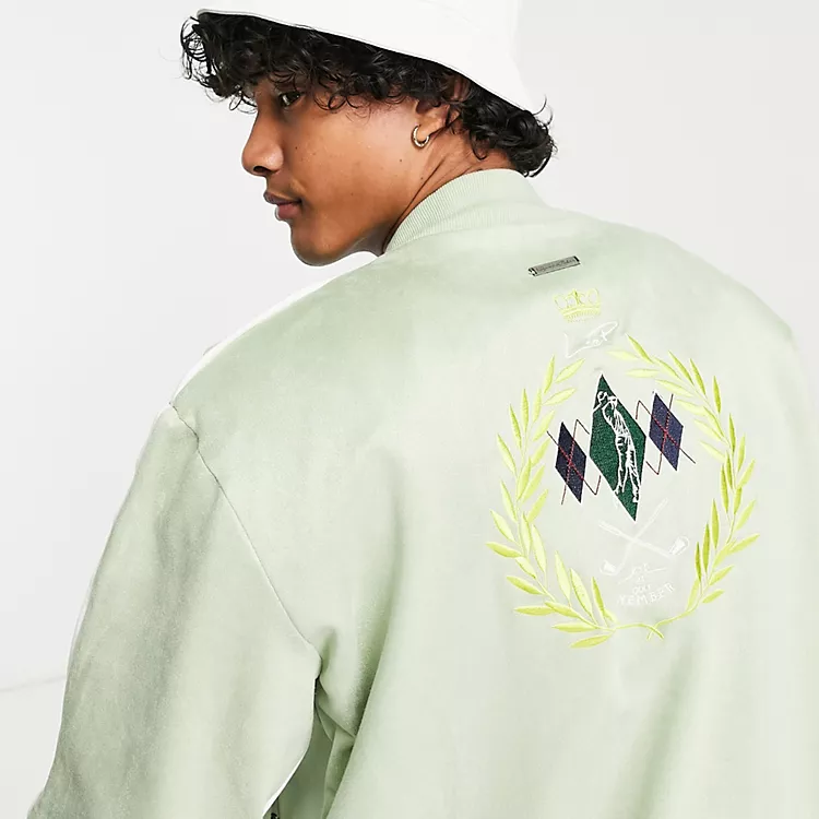 Liquor N Poker bomber jacket in sage green with golf club embroidery