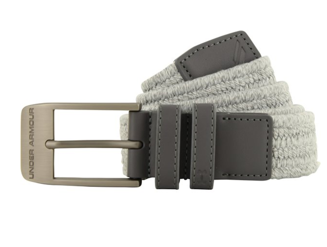 This stretchy woven web belt is perfect for on or off the course. The belt’s look is elevated by its metal buckle and leather end tabs.