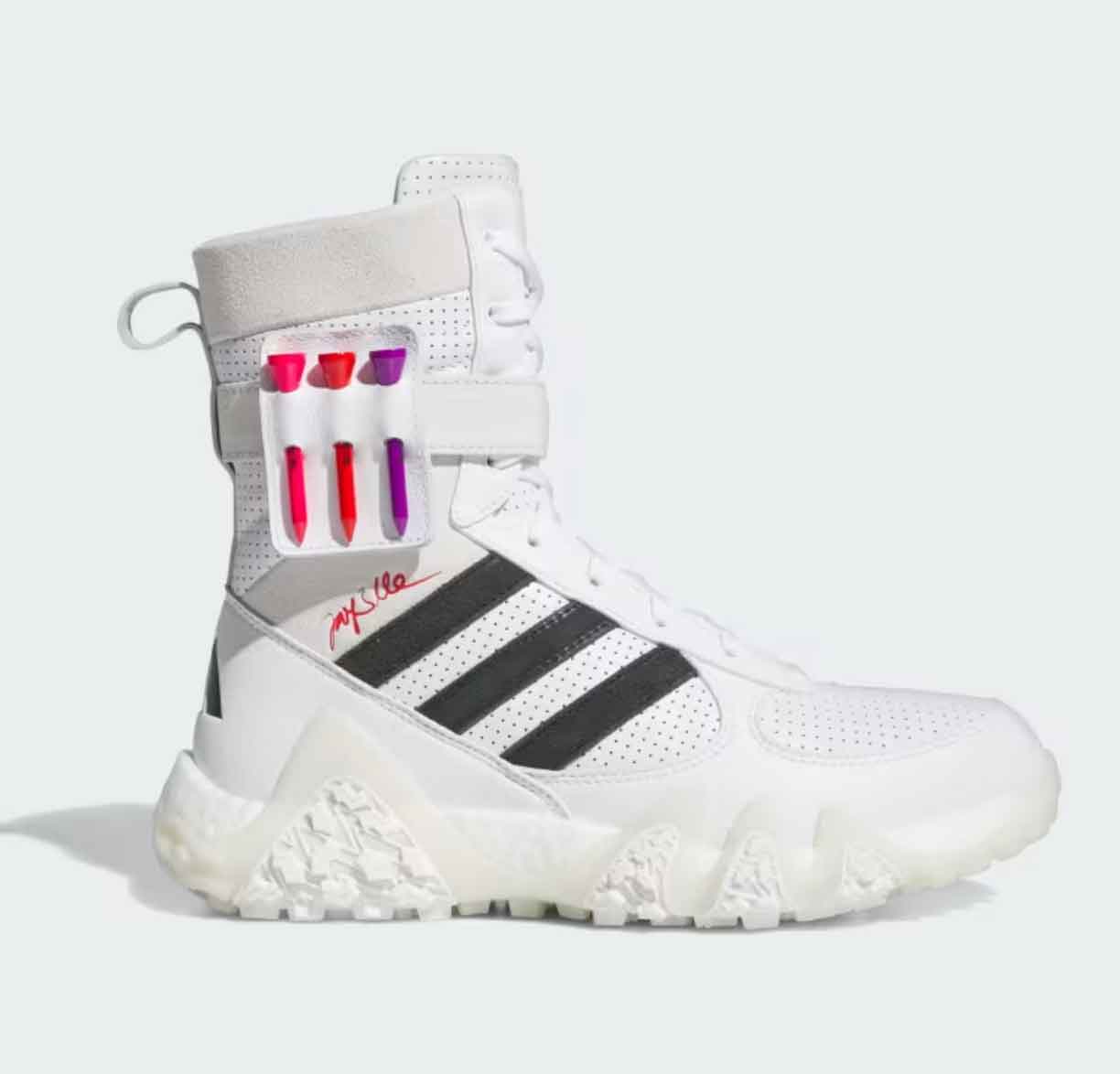 If you’re looking for a fresh look that makes a serious statement on the course, you’re a prime candidate for the new Adidas x JAY3LLE collab. The brand-new line features throwback styles like color-block track pants, a 3-stripe zip-up hooded puffer and even high-top “CODECHAOS” golf shoes, which come with a buckle and tee holder accessory.