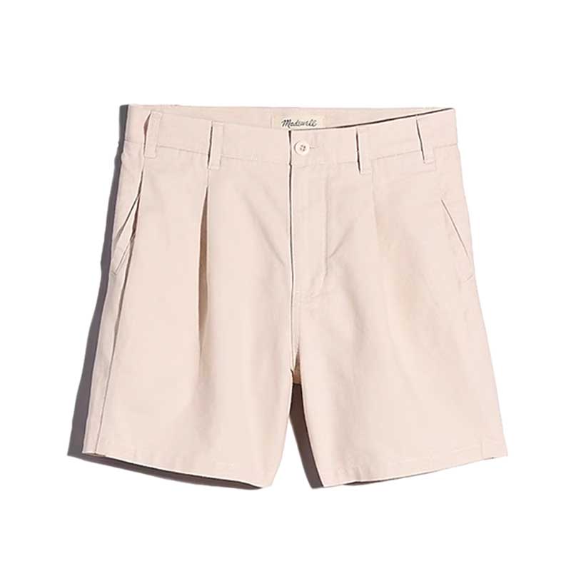 We love the idea of a retro-looking short-sleeved button-down paired with pleated shorts and some casual kicks.