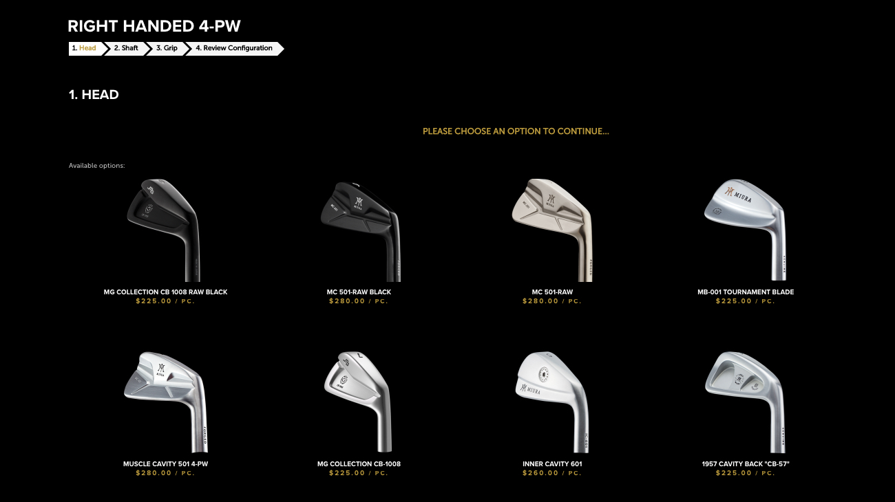 For a set of irons, the step-by-step process begins by selecting from three head finishes that can be matched up with 14 different grips and 18 shaft options. Loft, length, lie and tape wraps (underneath the grip) can be customized as well. And for those who want something other than a full set of MC-501 Raw irons, Miura confirmed more options are coming in the near future that will make it possible to build a mixed setup that flows seamlessly from the long to short irons.