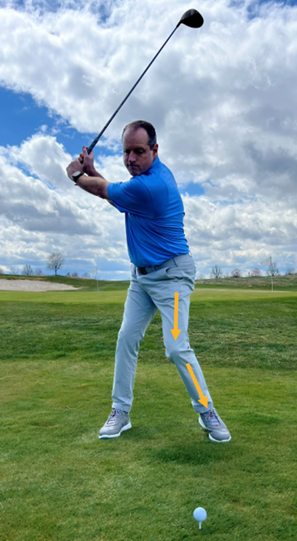 First, make a three-quarter swing and pause. Unless you have the flexibility of an Olympic gymnast (highly unlikely), your left knee will be pointing towards the inside of your left foot.