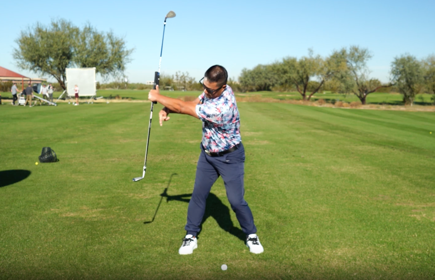 “Use this as a visual and a feel,” Hong says. “Set up to it, make a nice slow backswing, [have that club] pointing towards the ball the whole time, swing down and through.”