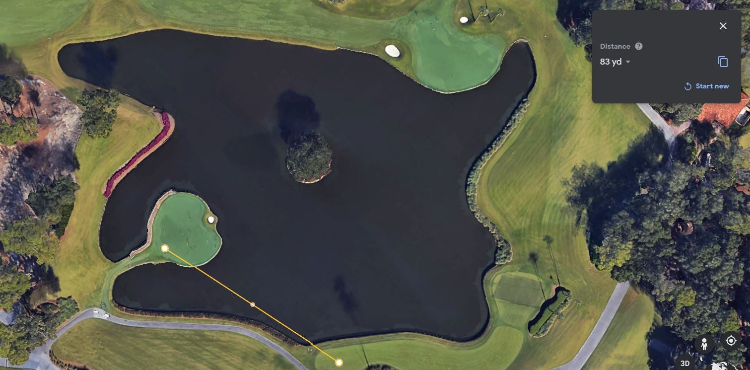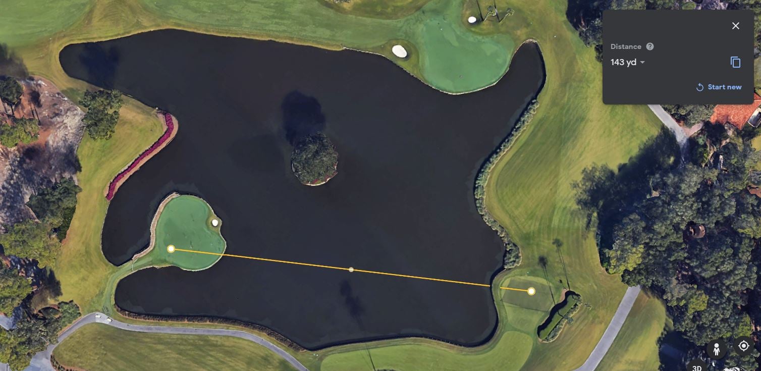 The distance from there to the pin is only 83 yards. From between 75 and 100 yards, the PGA Tour’s GIR average is more than 79 percent, with an average proximity of about 17 feet. But, of course, context matters, and Azinger’s right: The angle from drop zone to pin here really is terrible and has no room for error short, left or long. That said, the decision to use the drop zone itself is as much the issue as choosing the line to take. That’s why my advice would be, if you just dunked one in the water on 17, go up to the drop zone and don’t get cute with that pin. Forget about the flag; pitch it somewhere below the hole and try to make the putt.