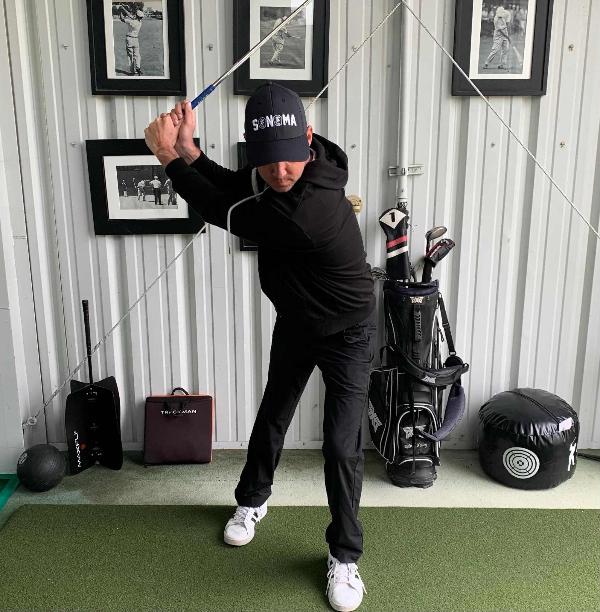 From here simply swing your arms to the top and hit the ball. This will give you the feeling of your lead side moving out and your trailside moving back. This drill will eliminate sliding off the ball and will ensure you are covering the ball with your body at impact.