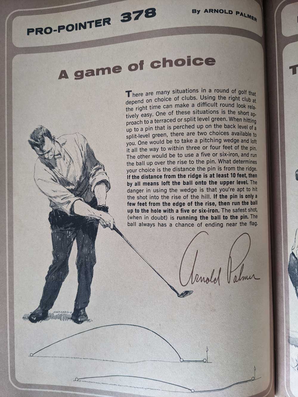 I’ve been working my way through a 1965 edition of GOLF Magazine recently, which has been both really fun and really informative. It’s fascinating to re-read the things golfers were talking about more than 50 years ago — both the similarities and differences. But the best part is when I stumble upon the places in-between: the timeless tips that are still useful but have been lost to history. I wrote about one from Gene Sarazen yesterday, and now I’m back with another tip from Arnold Palmer.