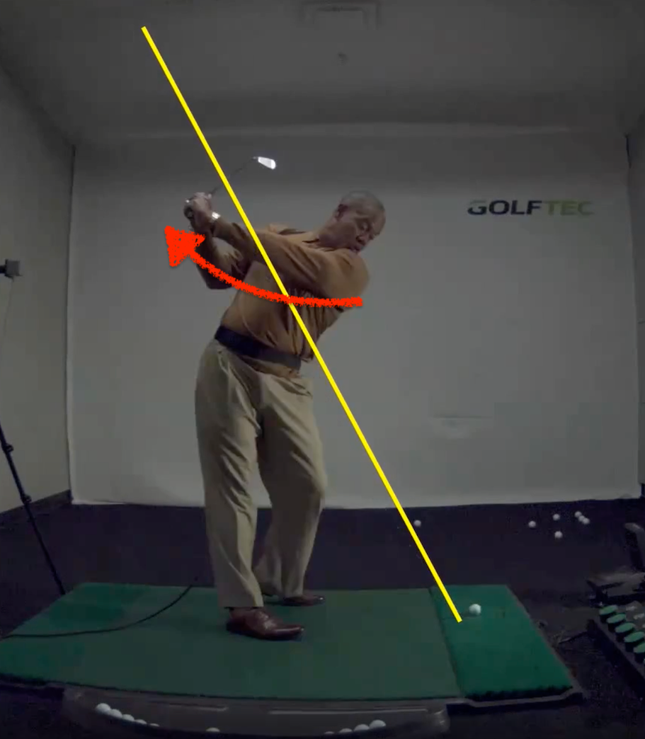 Parson’s was an 18 handicap, with an average score around 97. Then his coach, GOLFTEC’s Joel Rouleau, spotted a common issue that slicers make in their swings: Parson was lifting his arms out in front of him on the backswing. The pair, instead, worked on hand path. They wanted his arms deeper and more around him, starting on the takeaway — illustrated below, with a line drawn up the shaft, and watching to make sure his hands stayed underneath it.