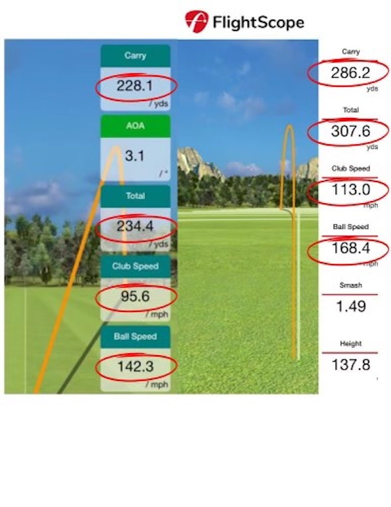 With the increase of 20 miles per hour in swing speed and approximately 30 miles per hour of ball speed, Chris is carrying the ball often 70 yards farther with his new swing! The video below shows the before and after.