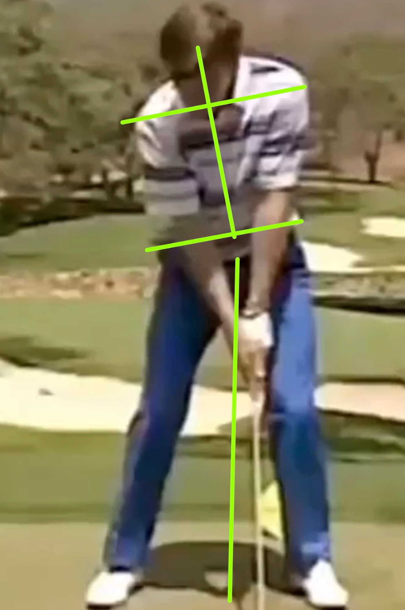 With the arm structure above, this allows your upper body to be slightly behind your lower body. This is the proper position of the body at impact. Note that the shoulder line also matches the eye line in Faldo’s setup.