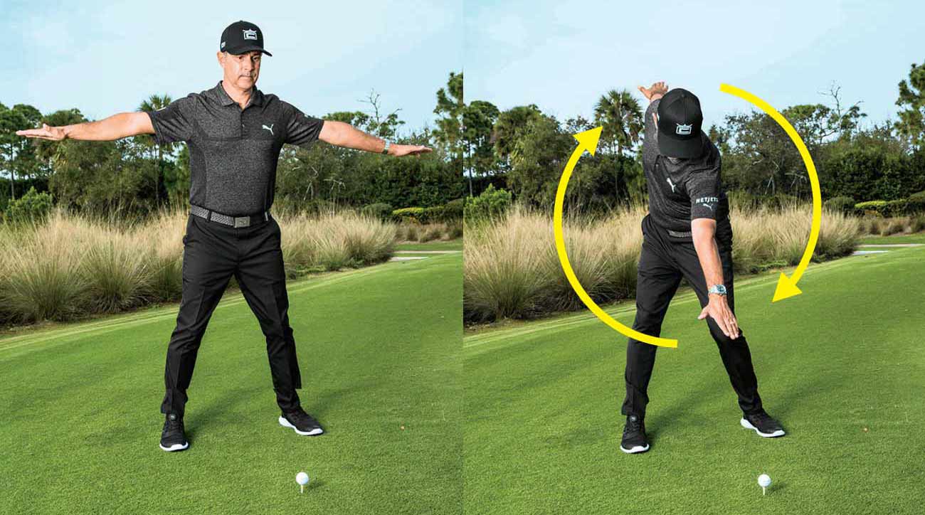 On the backswing, many amateurs tend to lift their arms and stand up straight—and right out of their posture. To correct that, I want you to be a helicopter. From your stance, stick your arms out to the sides, at shoulder-height (photo). Next, as in a regular backswing, make sure your front “rotor†is pointing toward the ground.