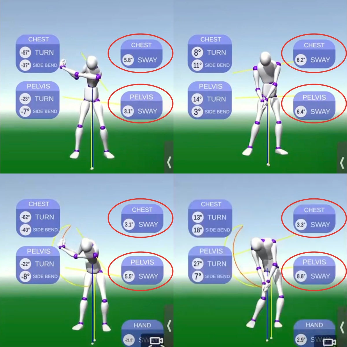Below you’ll find the 3D images of two different golfers. The top golfer struggles with a slice. The bottom player is on the PGA Tour. For both, Smith highlights two key metrics: chest and pelvis sway halfway through the swing and at impact. Look for yourself below, and you’ll notice the slicer’s chest is slightly ahead of his lower body.