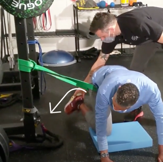 The first exercise he recommends is an internal rotation band distraction. Basically, you place a band around your hip joint and rotate your foot outward. Once you’ve gone as far as you can, you hold this position for two minutes. Then switch sides and repeat.