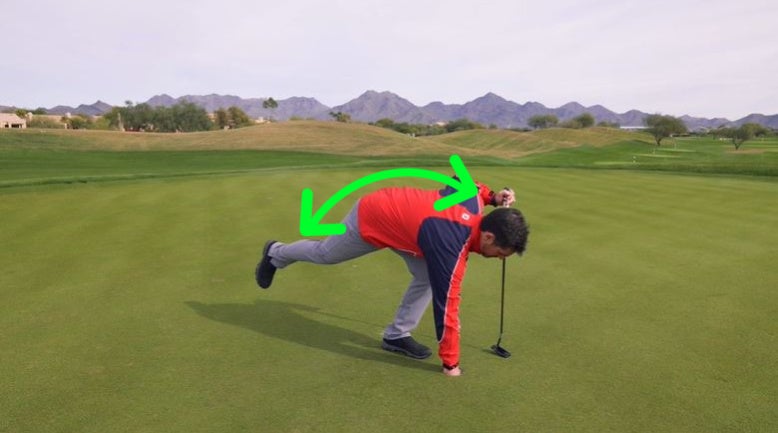 Instead, James recommends using the “pendulum” technique to get your ball out of the cup. Using your putter for balance, you swing your leg back, using it to counter-balance your torso as you lower yourself down, and then swing it forward gently as you raise yourself back up. (Looks kind of like a single-leg deadlift, right?)