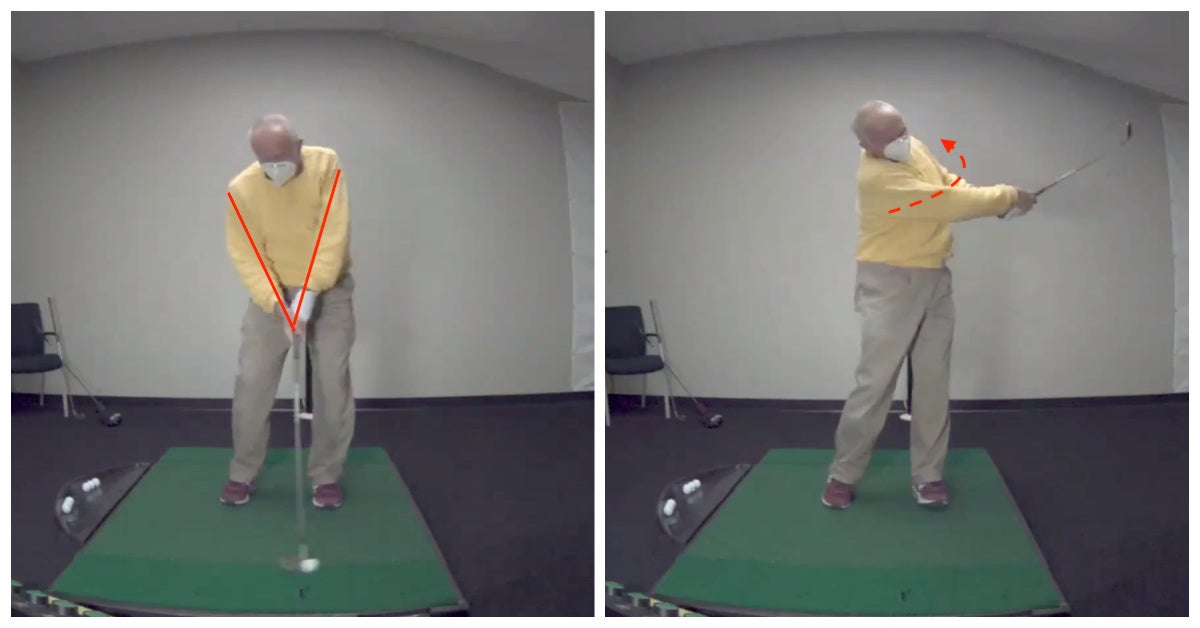 Specifically, Harry’s arms were too bent at impact, which caused a chicken wing in his swing. It was costing him power and consistency. Either his arms would be too bent, and he’d catch the ball thin, or they’d be too straight and he’d chunk the ball. The cause of this, Warfel said, quickly became clear.