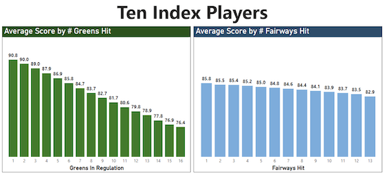 While the gap isn’t as wide for 5- or 10-handicap players, it’s still quite substantial (with the former seeing a difference of about five strokes per round, and the 10-handicapper seeing a difference of about six strokes per round).