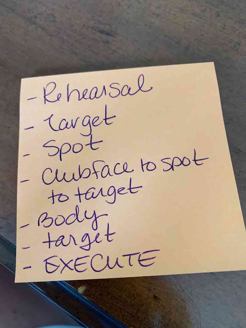 Ready to put this routine into play? I would recommend heading to the driving range with some Post-It notes and a pen. Start by writing down the steps and then simplify them down to one or two words. Here’s a picture of the one I use when I play in tournaments (see left).