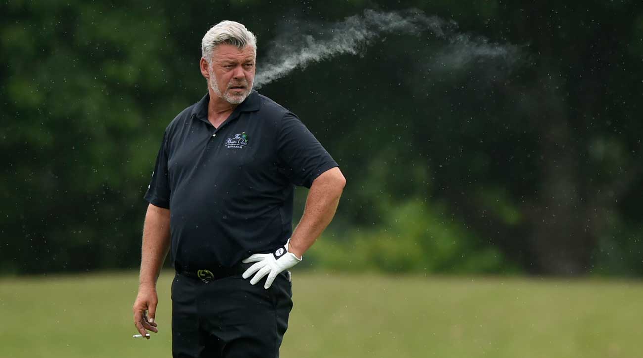 In the video shared to the Champions Tour’s social media feeds, Singh was checking Clarke’s distance from the ball at address. Clarke stood over his ball again.