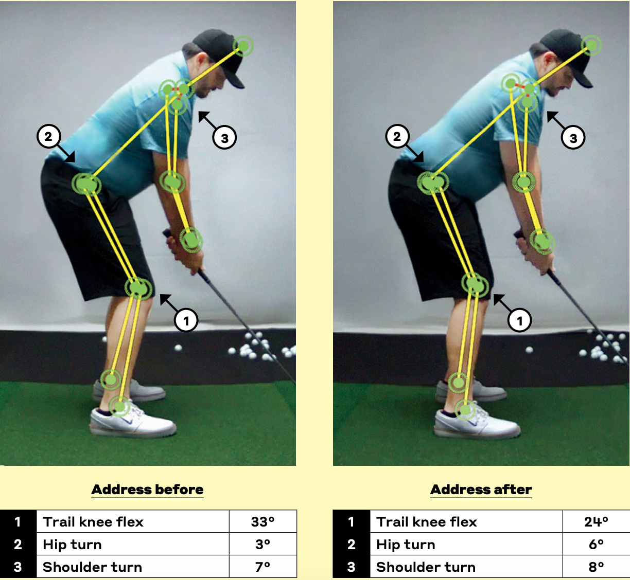Here, we have one of our high-handicap students, a self-described “inflexible” golfer. Subtle changes to his address position aside, you can see, with the help of OptiMotion, that decreasing the flex in his trail knee from setup to the top by 8 degrees (as in 8 degrees straighter) created 32 degrees more shoulder turn, a boost of over 40 percent! Not-so-fit golfers who don’t change their knee flex as dramatically or for as long typically result in low shoulder turns and grounders. Basically, the lack of extension from the ankles to the hips makes turning too difficult. It’s the equivalent of being in a body cast from the waist down; you have to get out of the cast to move the segments of your body above your hips.