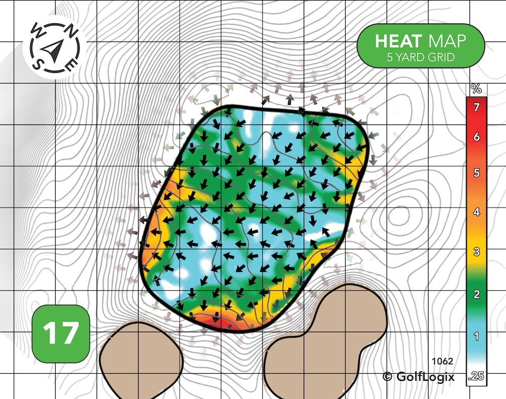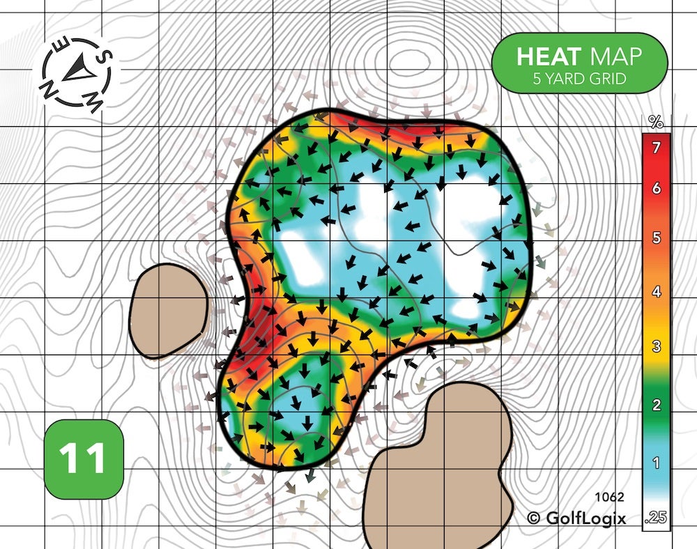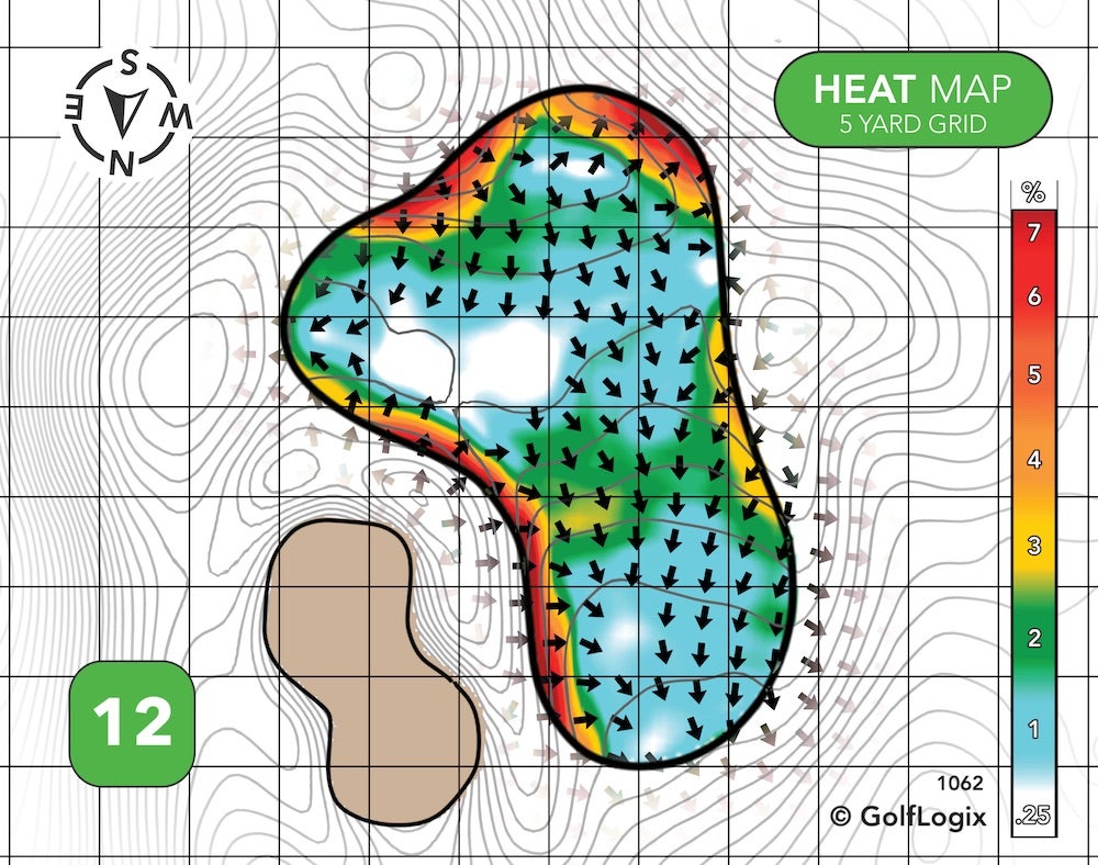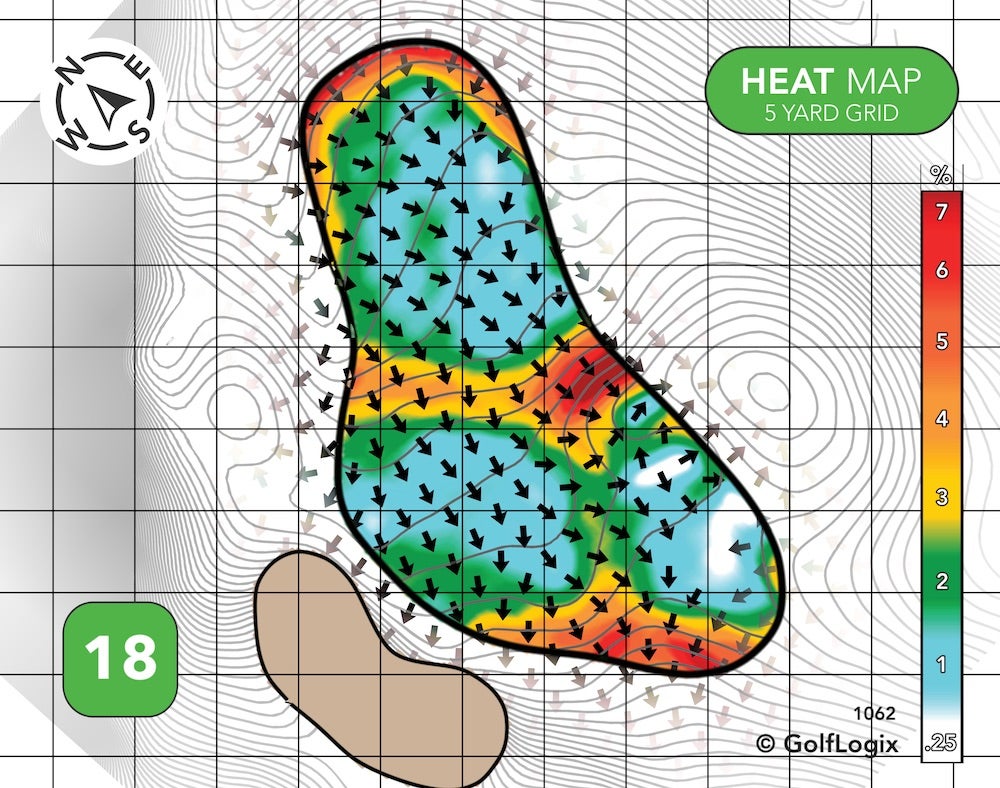 The green runs almost exclusively back-to-front. Hitting your ball past the pin, if the hole is up front, could leave you with a slippery putt, and a drop-off long right could threaten those who try to get greedy if and when the pin is on that crown.