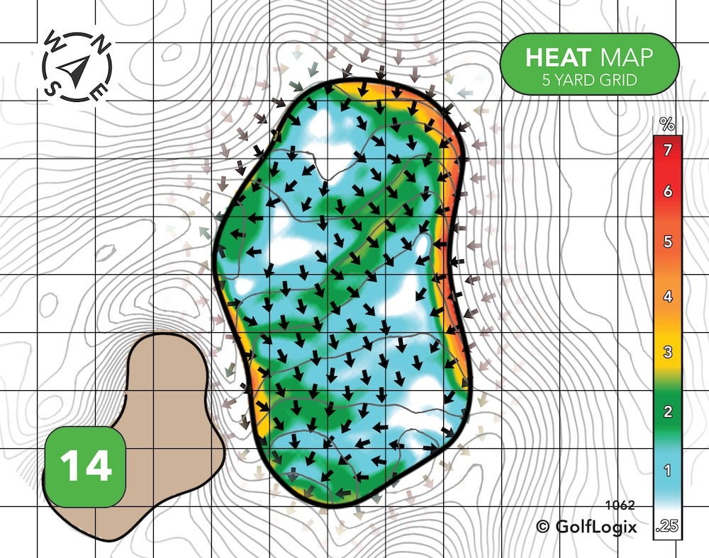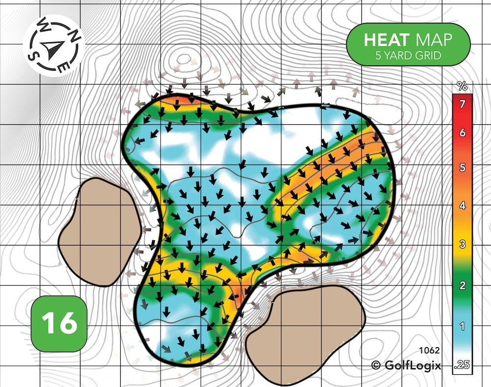 The most dangerous part of this green is the potential of your ball running off into one of those valleys long left or long right. If you can avoid that, most of the rest green features some pretty subtle breaks.