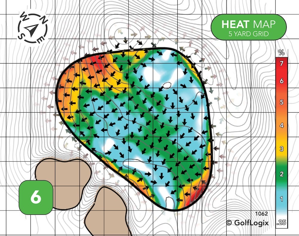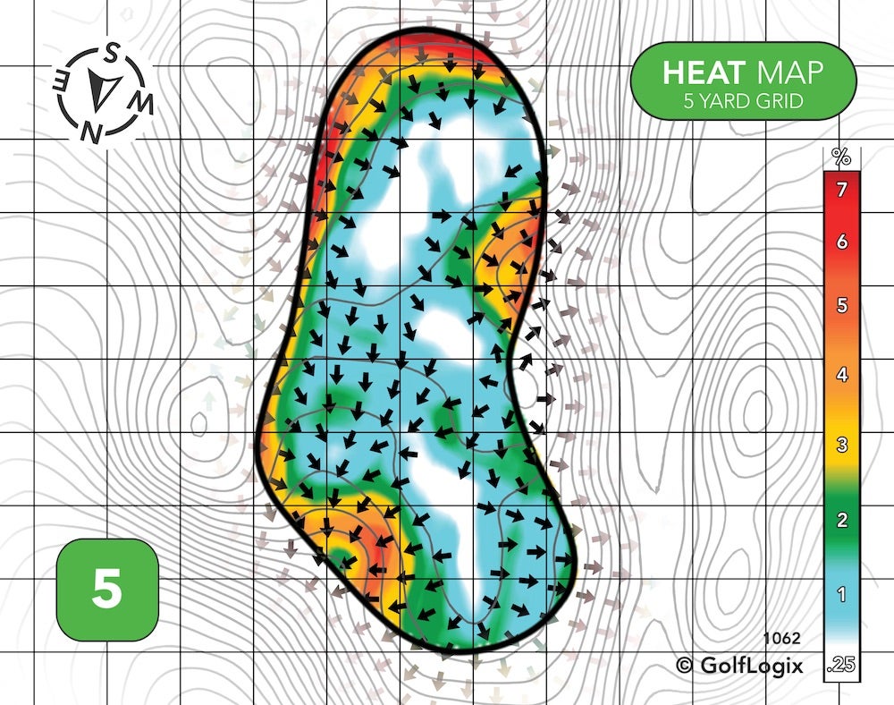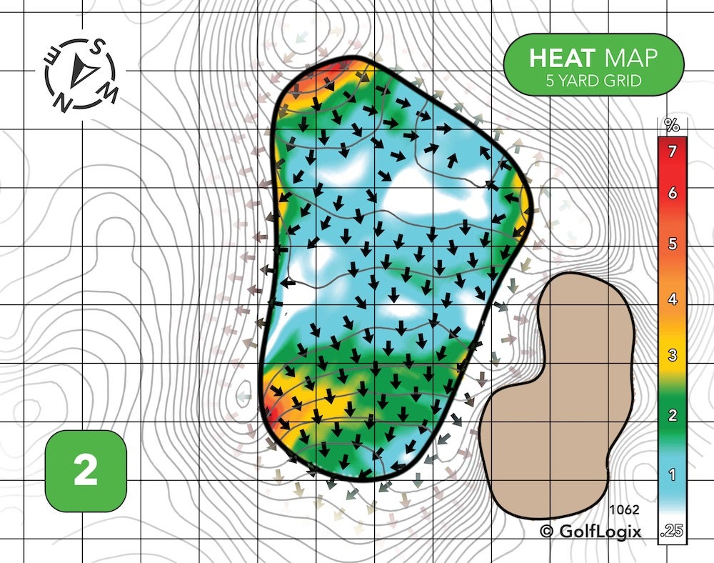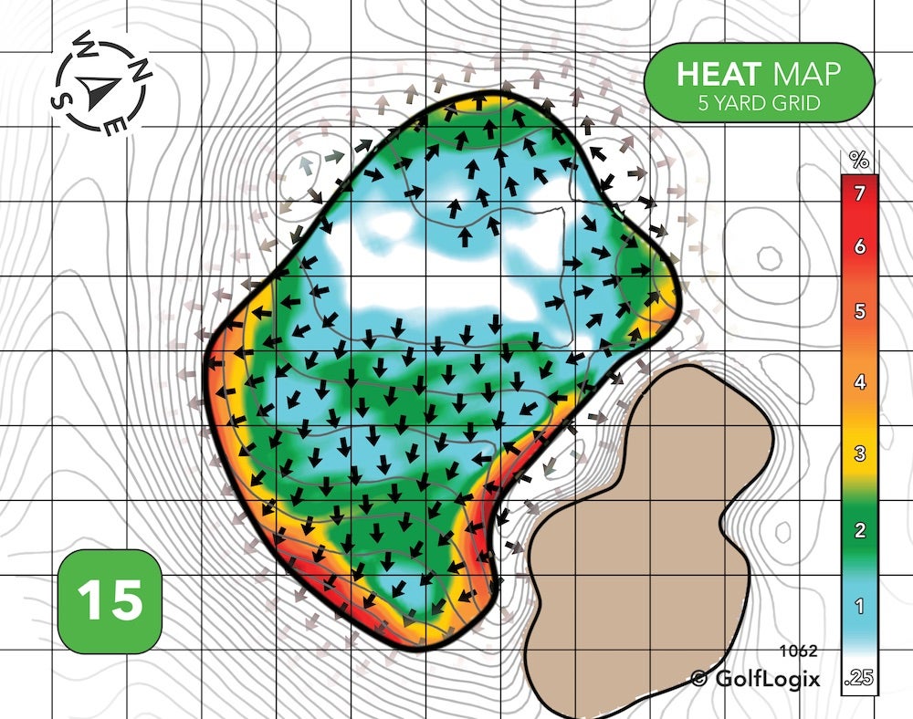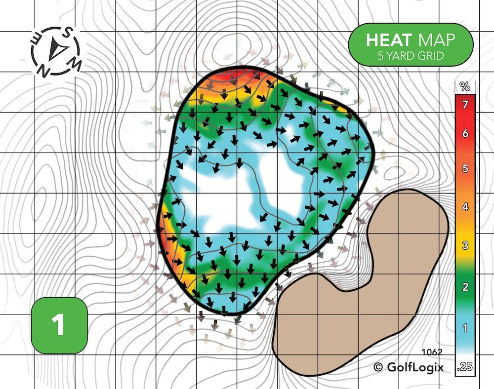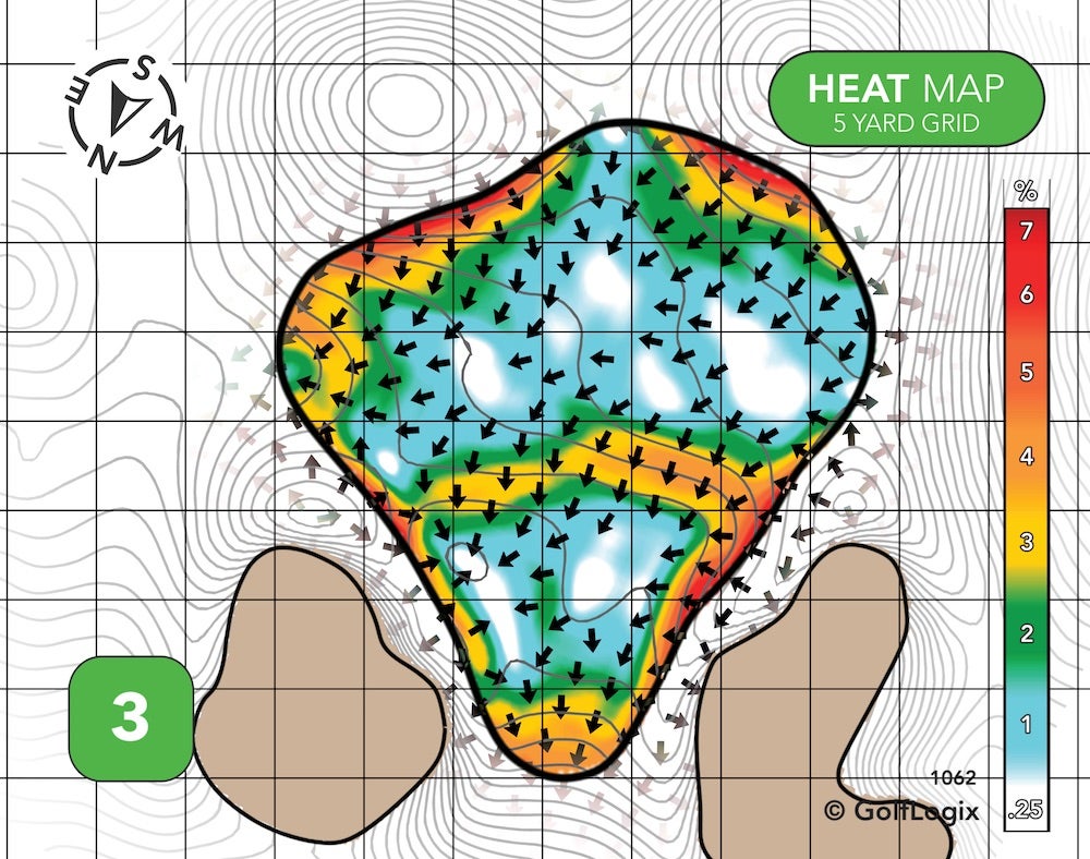 Two different ridges effectively cordon-off the green into three sections: Very front-left, back-right, and everywhere else.