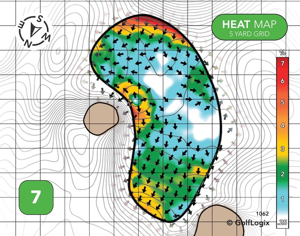 A spinny wedge could potentially funnel away from you on green at the short, ~340-yard par-4 7th. Control the spin coming into this one, and it provides another good birdie opportunity.