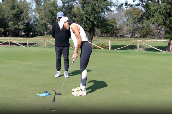“The line of her putter is right on the line of the [putting plates where the ball sits], the Sharpie line is pointing right at the hole, all of her [body] lines are perfectly square, and her eye-line is looking right down at the ball,” he says.