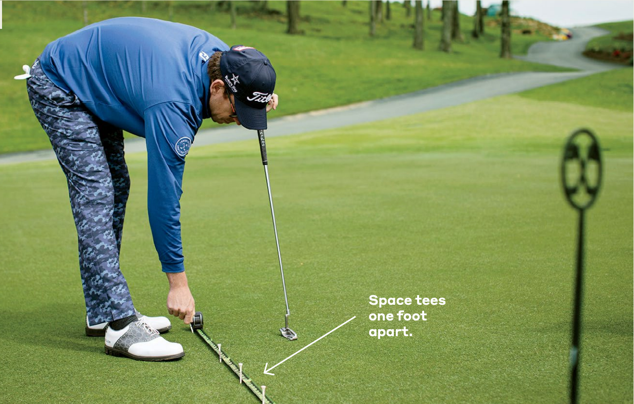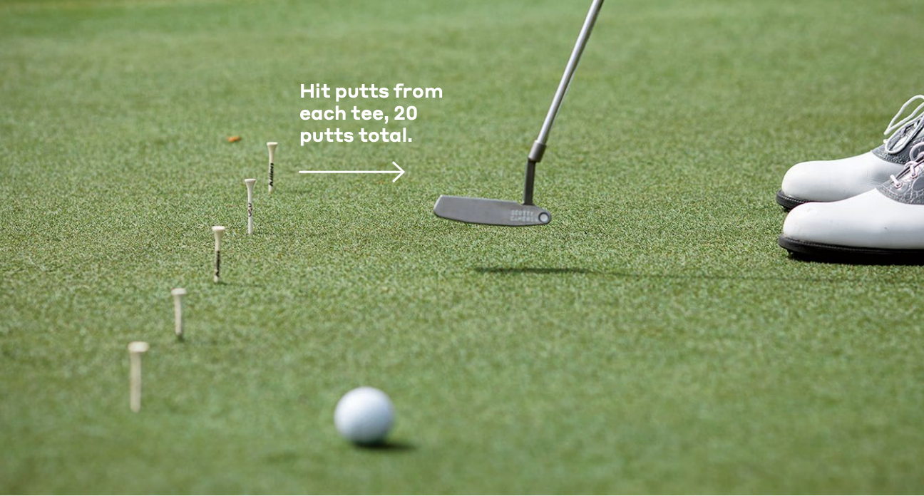2. Begin hitting putts, moving around the hole so you never putt in the same direction twice in a row. (You’re going to do this in each of the four directions around the cup, which means you’ll need 20 tees total.)