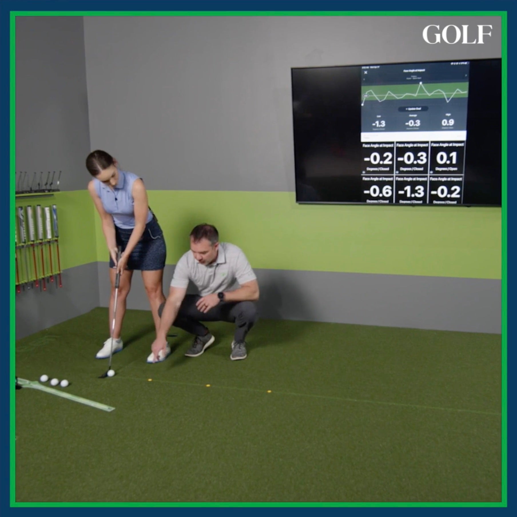 If you’re trying to nail down your start line, the first thing you can do is to literally use a line on the ground. A series of dots works just as well, but either way, find a straight putt and draw a line on the ground. Then start hitting putts making sure your ball rolls down it, Cleartwater says. If the ball starts left, the putter face is closed. If it starts right, it’s open.