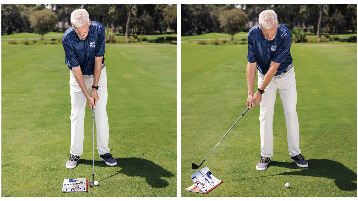 Make your takeaway as smooth as silk. Place your copy of GOLF magazine with the bound side behind your 6-iron. Your goal is to sweep the magazine out of the way on your backswing. By doing so, this will insure that your takeaway is online, level and smooth in speed.