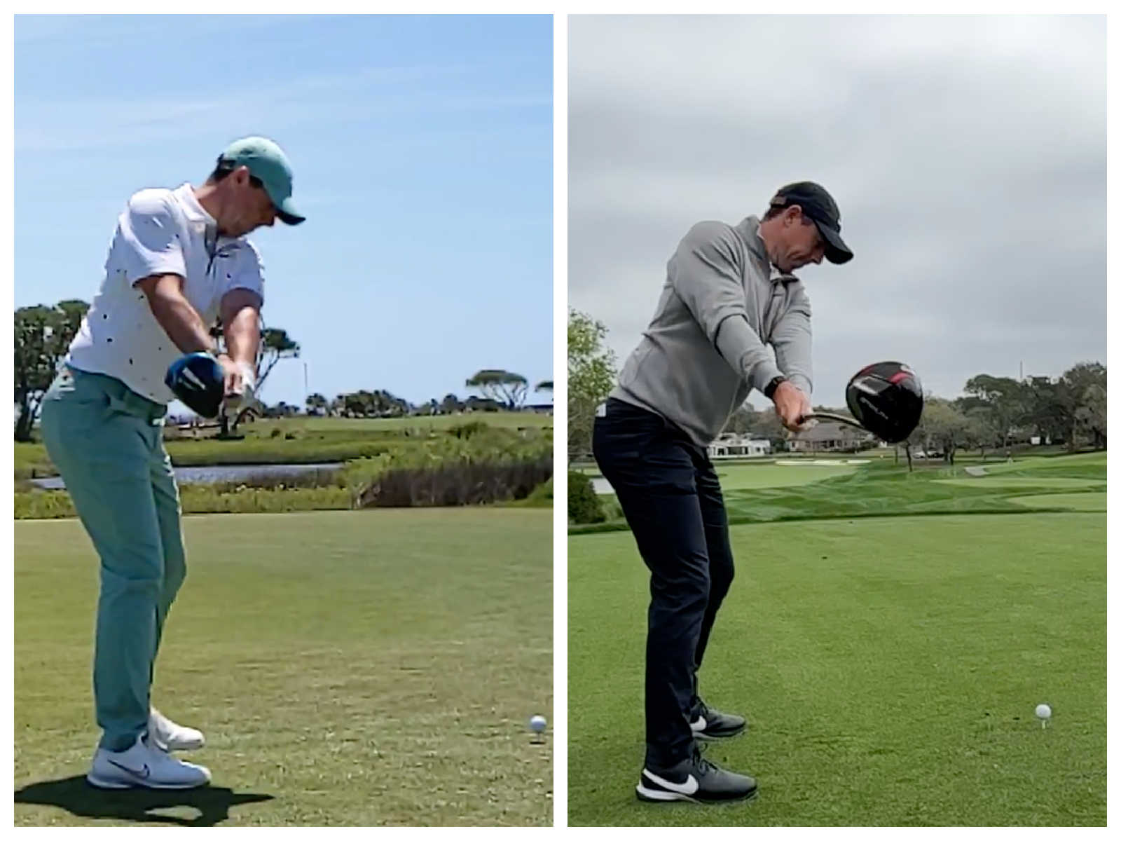 On the left is an image of Rory, club parallel, at the 2021 PGA Championship last May. On the right is Tuesday at Bay Hill.