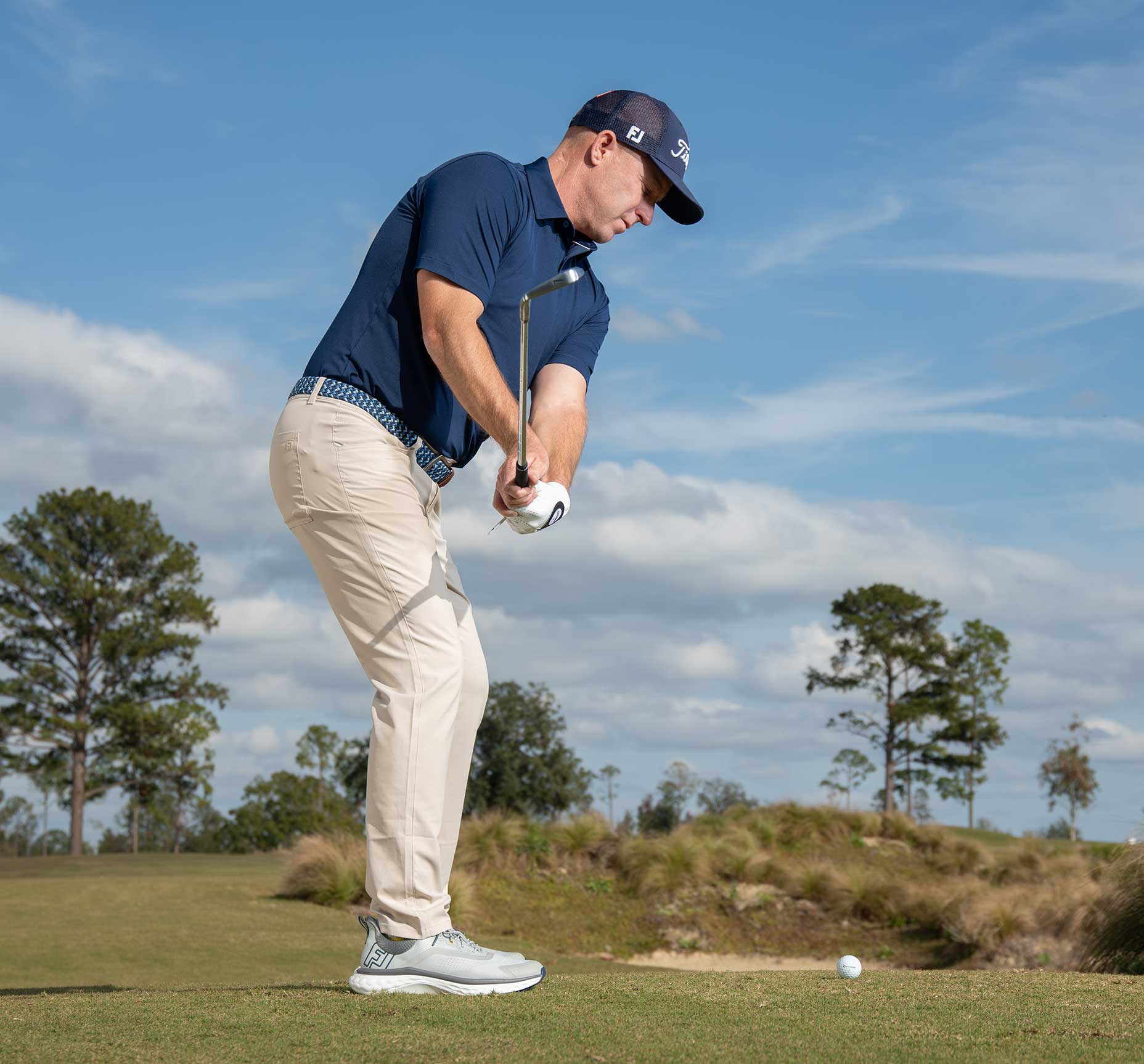 Stick a tee between your middle and ring fingers on your glove hand, as shown in the photo above. Address the ball as normal and start your backswing. Here’s the checkpoint: When the club gets parallel to the ground, make sure the tee points toward your trail leg. (Slicers will have the tee pointing more toward the ground.) As you reach the top, check that the tee points more toward the horizon. It’s a great visual to teach you how to control the clubface without getting too technical or fretting over mechanics.
