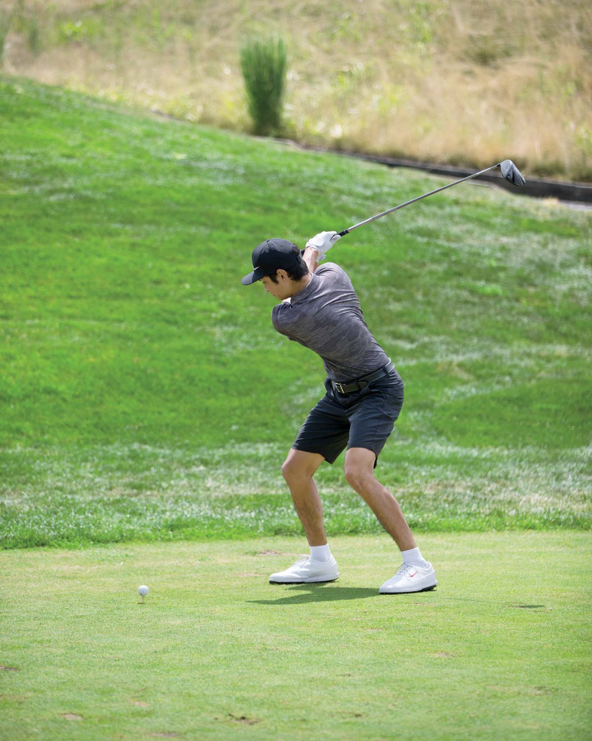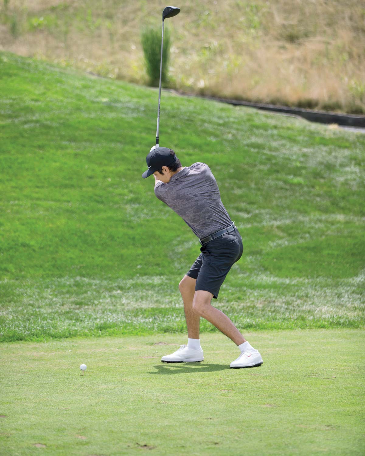 Patrick’s left-hand-low grip isn’t only for his personal comfort—it virtually eliminates any upper body tilt away from the target at address. Check his setup at the top of the page and you’ll notice that his shoulders are perfectly level. Normally, you need some tilt to create height, but Welch has no problem launching it high (see No. 5). Also, notice his extra-wide stance, which as you’ll see plays a major role in his backswing. As for the two gloves, you can’t help but love the kid’s style.
