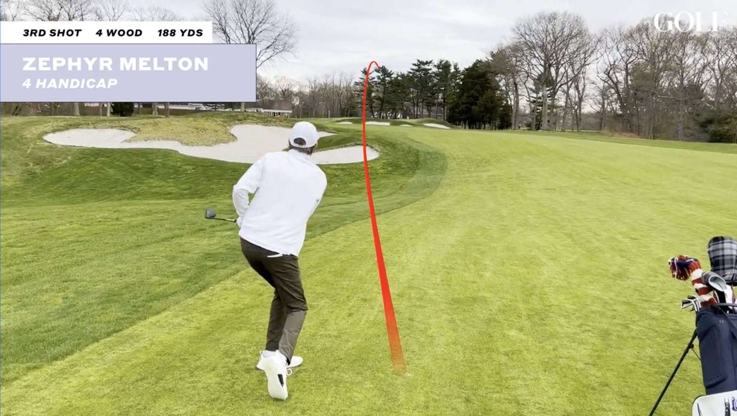 Speaking of GOLF Magazine staffers who are good at keeping the ball in play: Zephyr basically never misses a fairway. A drive in the short stuff followed by a 3-wood up the shoot left him 188 yards away for his third shot, with the green elevated and bunkers short that effectively made it all carry. Ordinarily this is a hybrid, but Zeph pulled his 4-wood — which usually carries around 200 yards, he says — and hit a fantastic shot to within birdie range. Zeph isn’t the longest player in the world, but this shot showed why he’s a very good player anyway. He’s clever, and avoids the common mistake golfers make of not taking enough club.