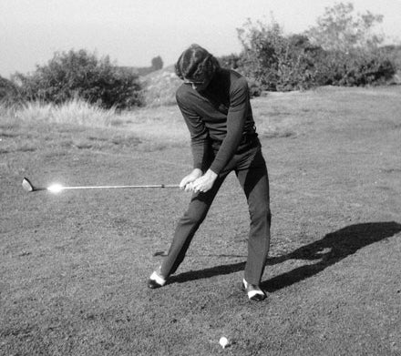 When you think of simple, powerful and repeatable golf swings you think of Peter Thompson. The beauty of Thompson’s swing actually lies in his set-up. In the picture above, note how Thompson’s right arm is tucked and bent, underneath his left arm. This drops his right shoulder below his left, setting his body up to be in a great position at the top.
