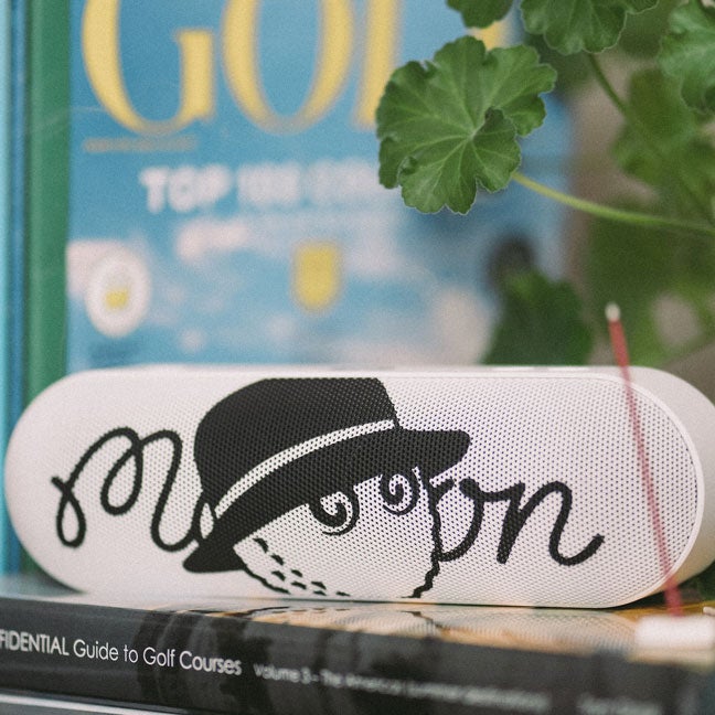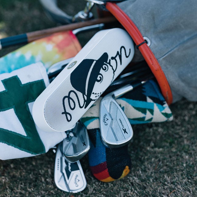 This Malbon Golf x Beats by Dr. Dre collection of limited-edition goods, which debuted on Friday morning, leads with a white Beats Pill+ speaker that’s boldly branded with Malbon’s script lettering and unmistakable Buckets logo — this time, the logo is wearing a bucket hat that has the Beats “b” logo. The collection also includes a bucket hat, rope hat and visor, along with a simple T-shirt and crewneck sweater, all offered in the simple colors of black and white and, just like the speaker, branded with the same eye-catching Beats-branded Malbon logo. Rounding out the collection is a sleeve of Callaway Chrome Soft balls stamped with the same unmistakable logo.