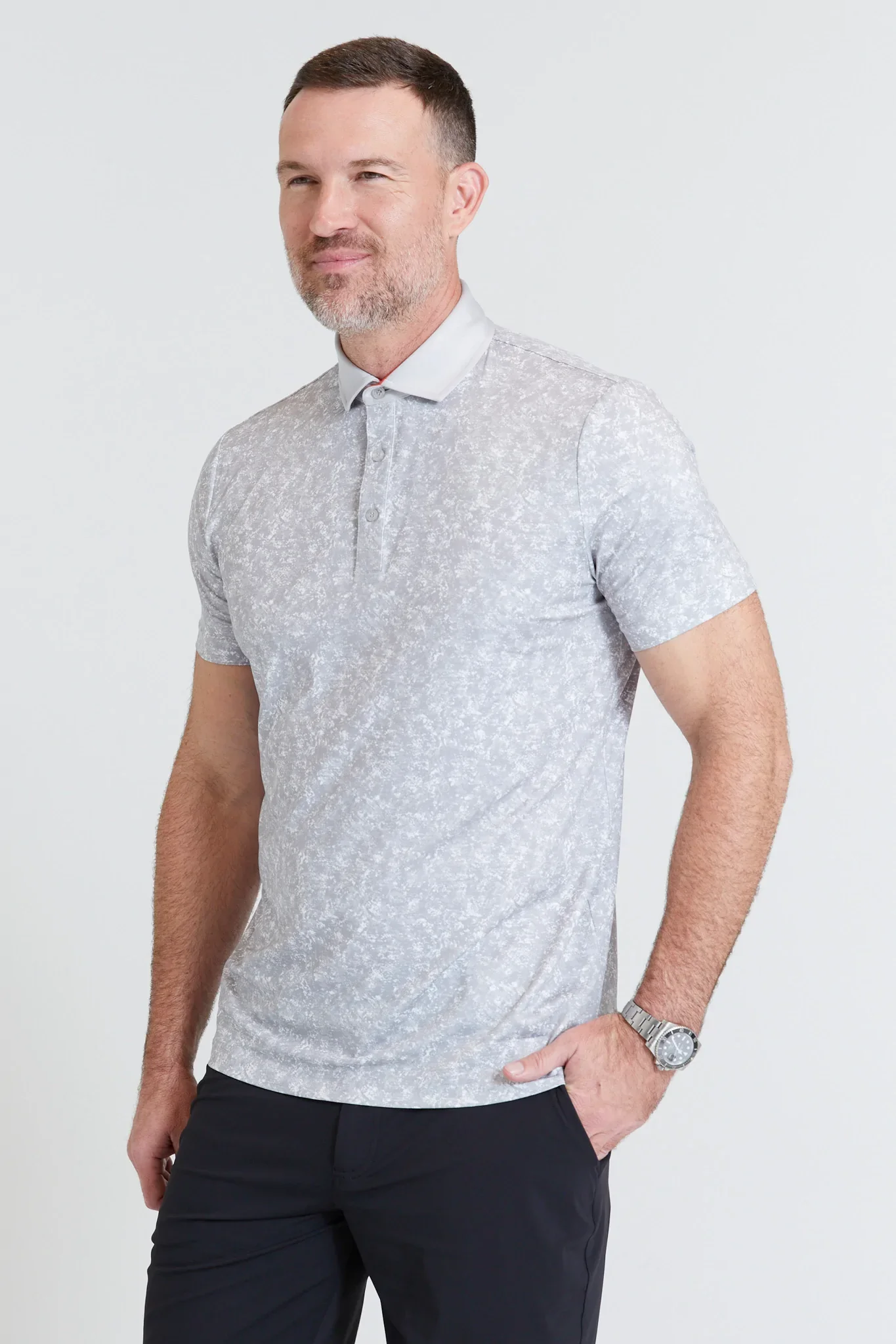 These Footjoy repeat pattern shirts are classy and subtle. I’ve also included 5-pocket pants and a favorite spikeless shoe. These pieces are fashion-forward and the ultimate comfort for spring/summer on the golf course.