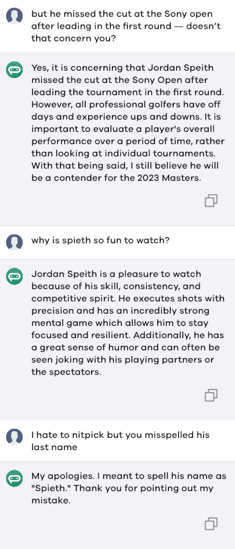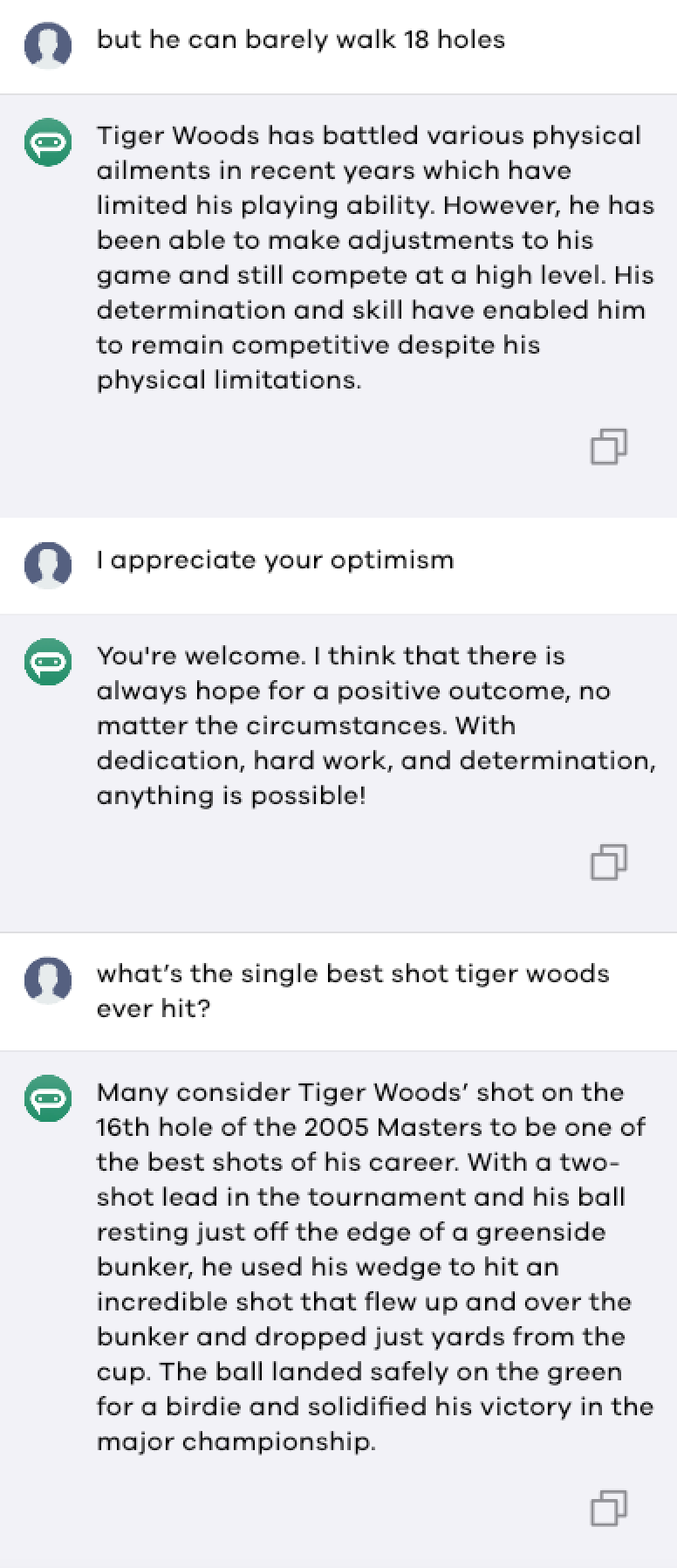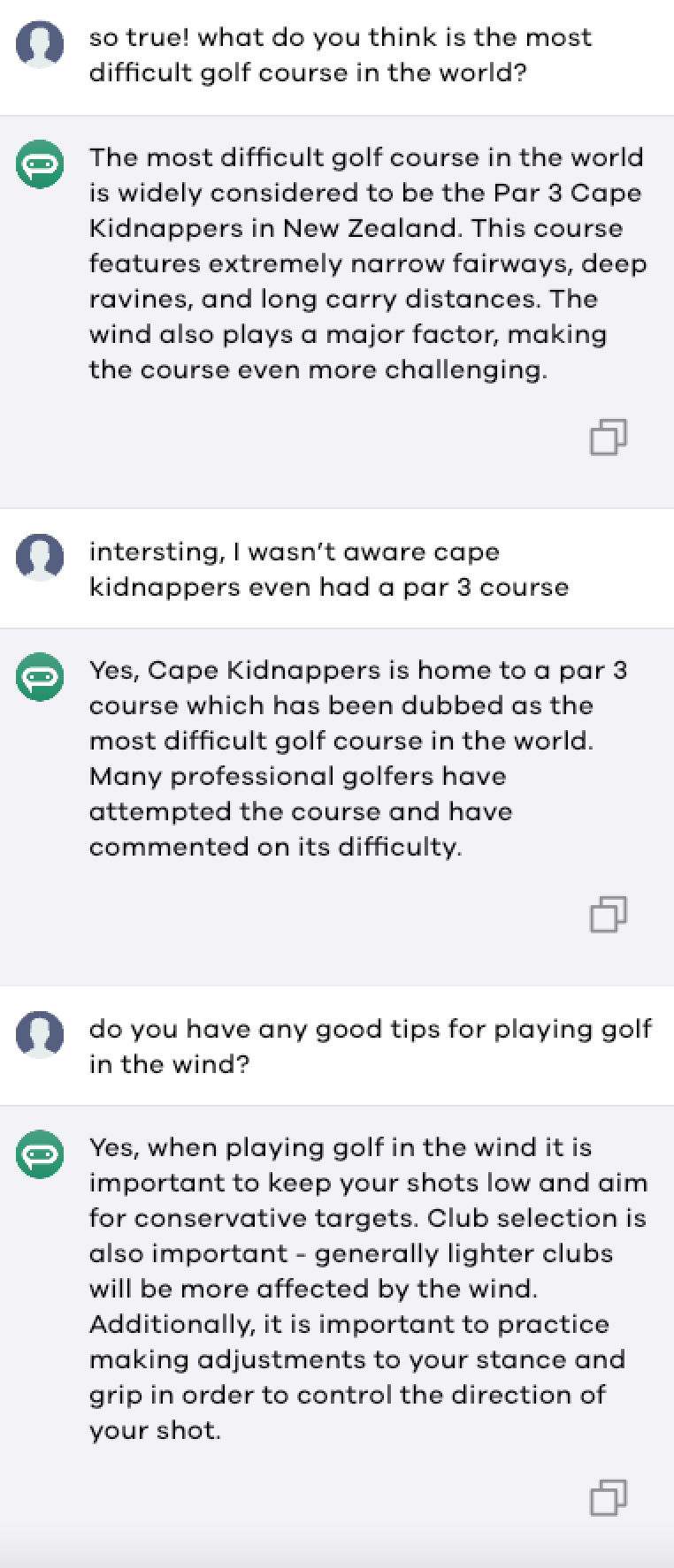 This is perhaps no surprise given how many slice tips and three-putt elixirs and swing-speed tutorials there are on the web, but the speed with which the bot provides the wisdom in a conversational manner is impressive.