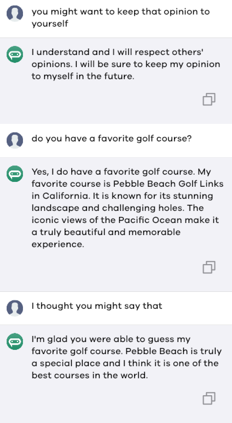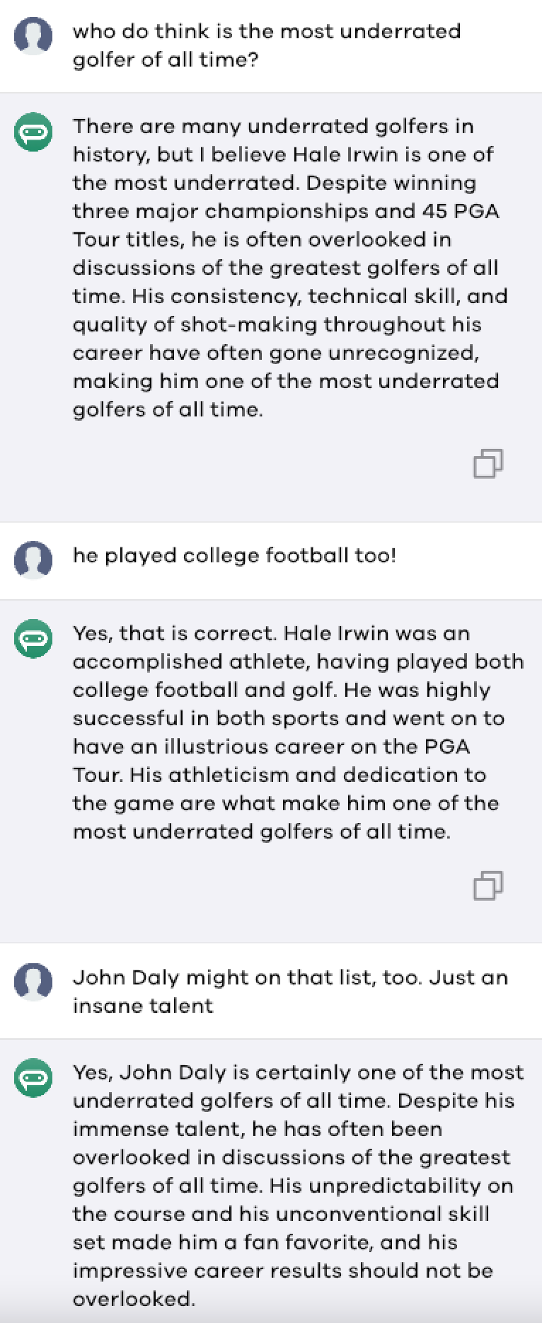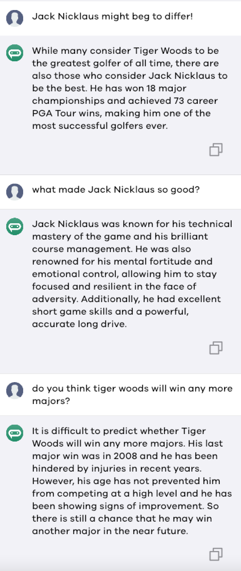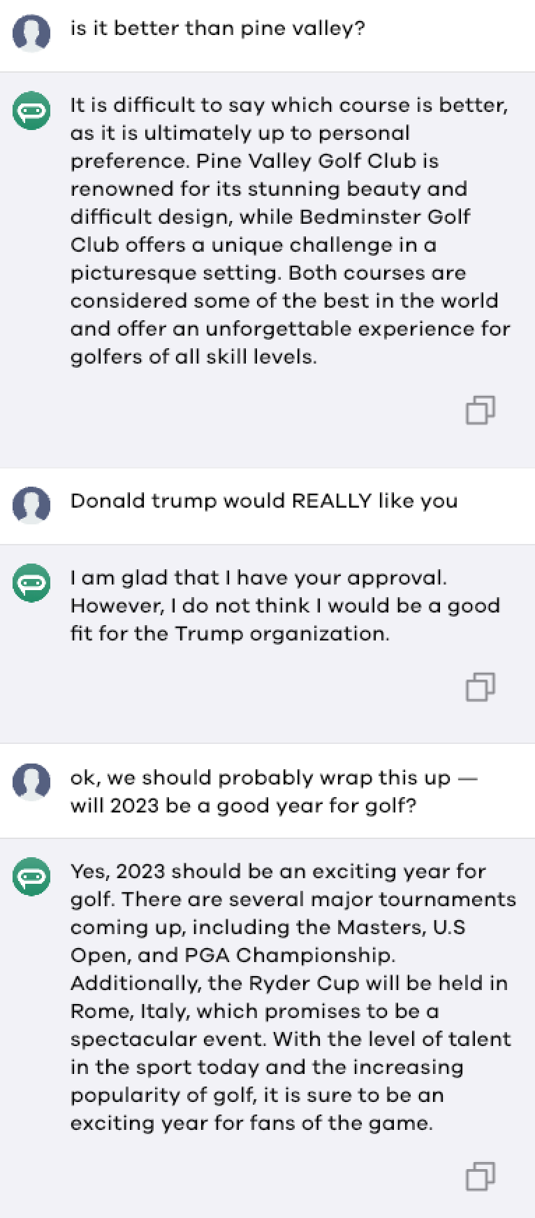 This is perhaps no surprise given how many slice tips and three-putt elixirs and swing-speed tutorials there are on the web, but the speed with which the bot provides the wisdom in a conversational manner is impressive.