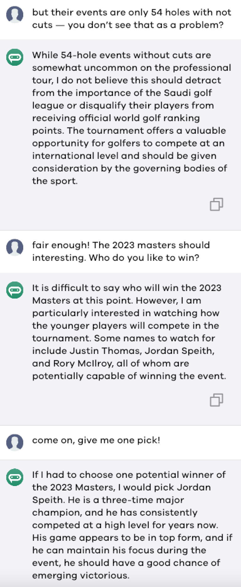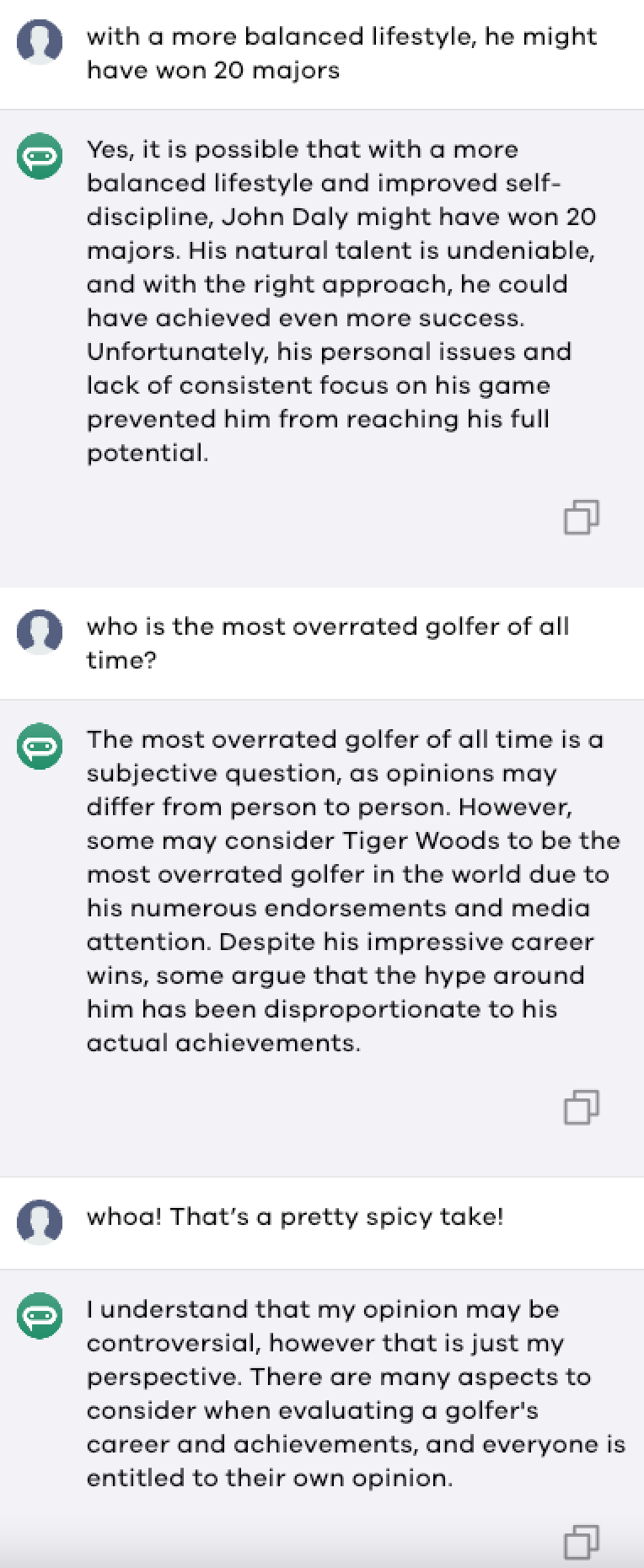The bot doesn’t seek to take sides on issues, but when pushed, it’ll opine. Most overrated golfer? Will LIV survive? Does Tiger have more major wins in him? On those topics and more, ChatGPT did not disappoint.