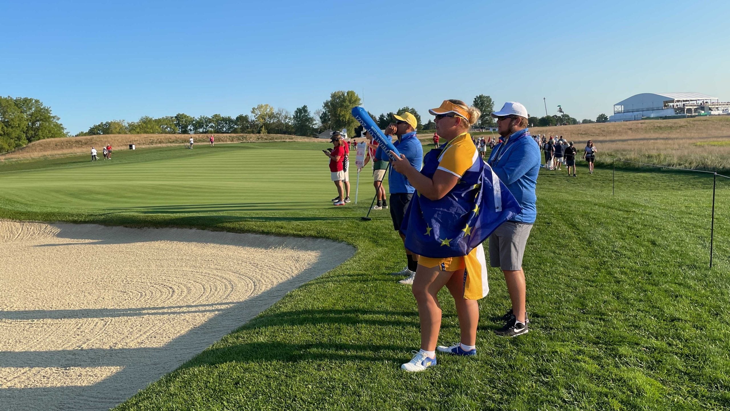 But if you’ve been following the Solheim Cup on the ground or on TV, you’ve probably seen her with banging blow-up noise makers together with a European flag draped around her, or proudly flying the blue-and-yellow off the side of a golf cart.