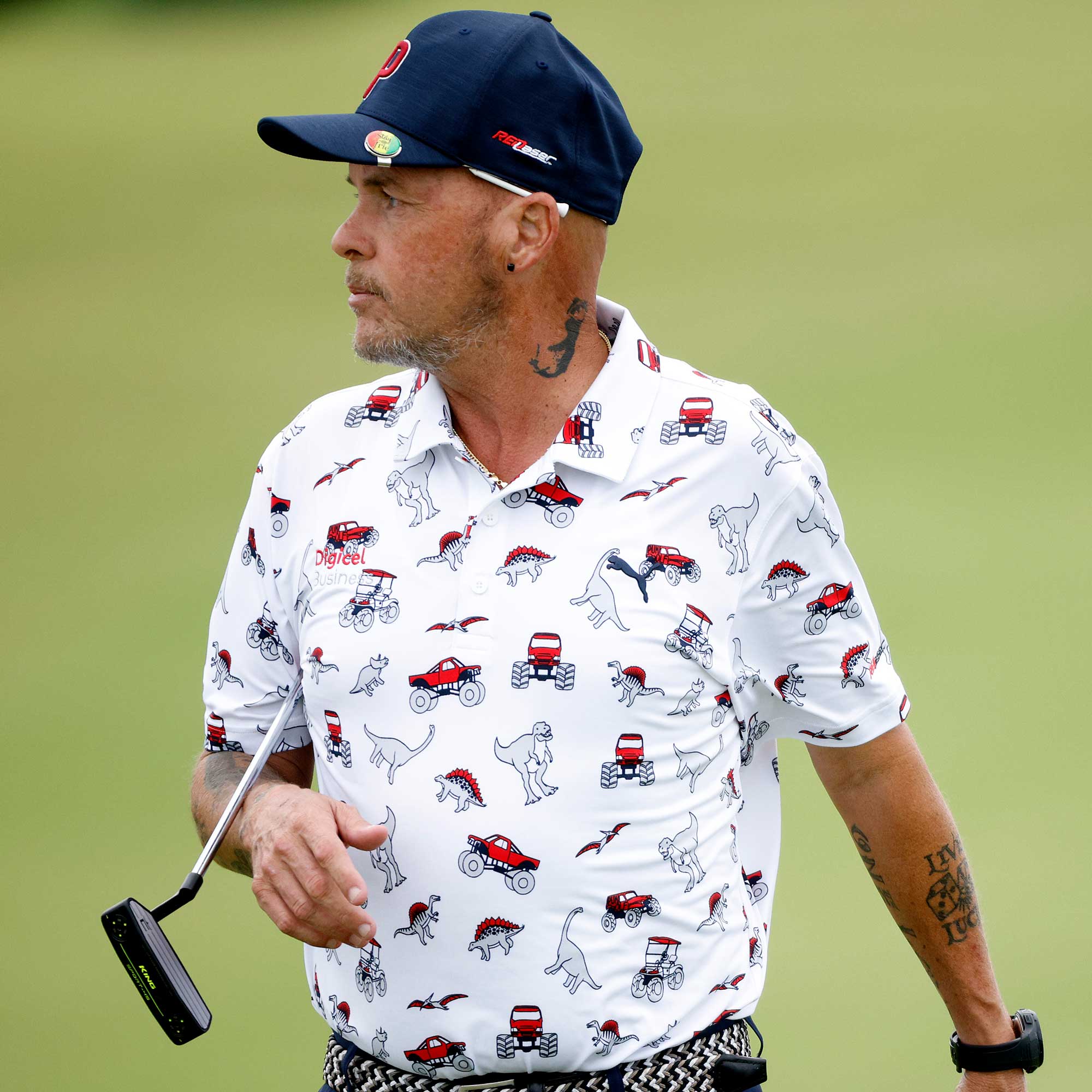 Brian has an interesting face. I mean, it’s right up there with Harvey Penick’s, who had creases on his so deep they could hold (people used to say) a seven-day rain. Brian has bright blue eyes and an impish, boyish face, save his wispy seafarer’s beard. He often has a long tee stuck behind one of his ears and there’s a black stud in his left earlobe and another in his right. He played his Friday round wearing a white shirt dotted with cartoon red-and-black monster trucks. A great shirt. It helps that Brian has the elfin physique, and matching spirit, to pull it off.