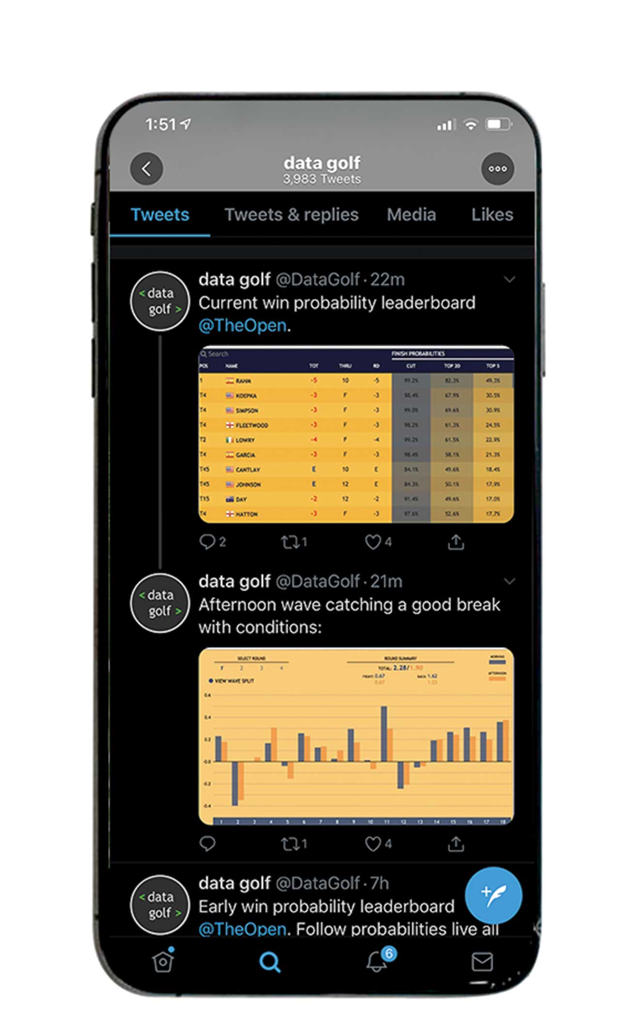 Through mid-July, the Data Golf betting model was beating the betting market, and like other aspects of the site, it is a work in progress. “Ours puts a lot more weight on a player’s long-term form than, say, short-term form or course history,†says Matt. “We aim for our model to offer a really solid baseline every week, because golf is such a fickle game. There are always ways you can improve upon our model problem by knowing things like when a player is struggling with their health or in their personal life, and sometimes you can just learn a lot from watching somebody play golf—but you can also get misled. Our model is pretty simple, and it’s focused on doing something mathematically sound with a long stretch of scores for each player.â€